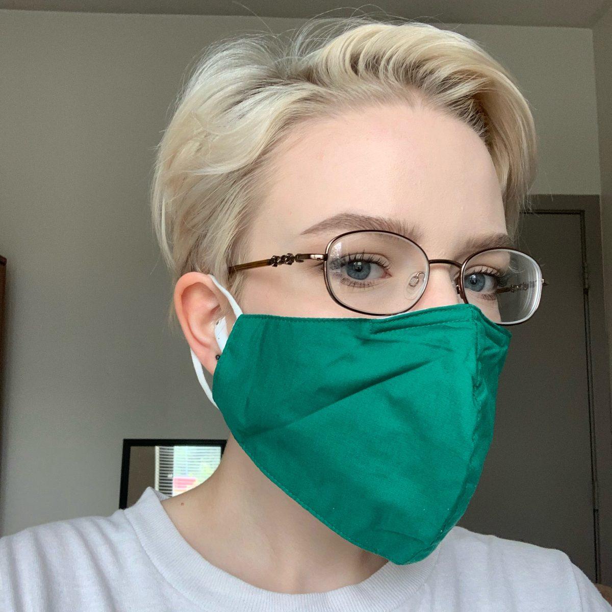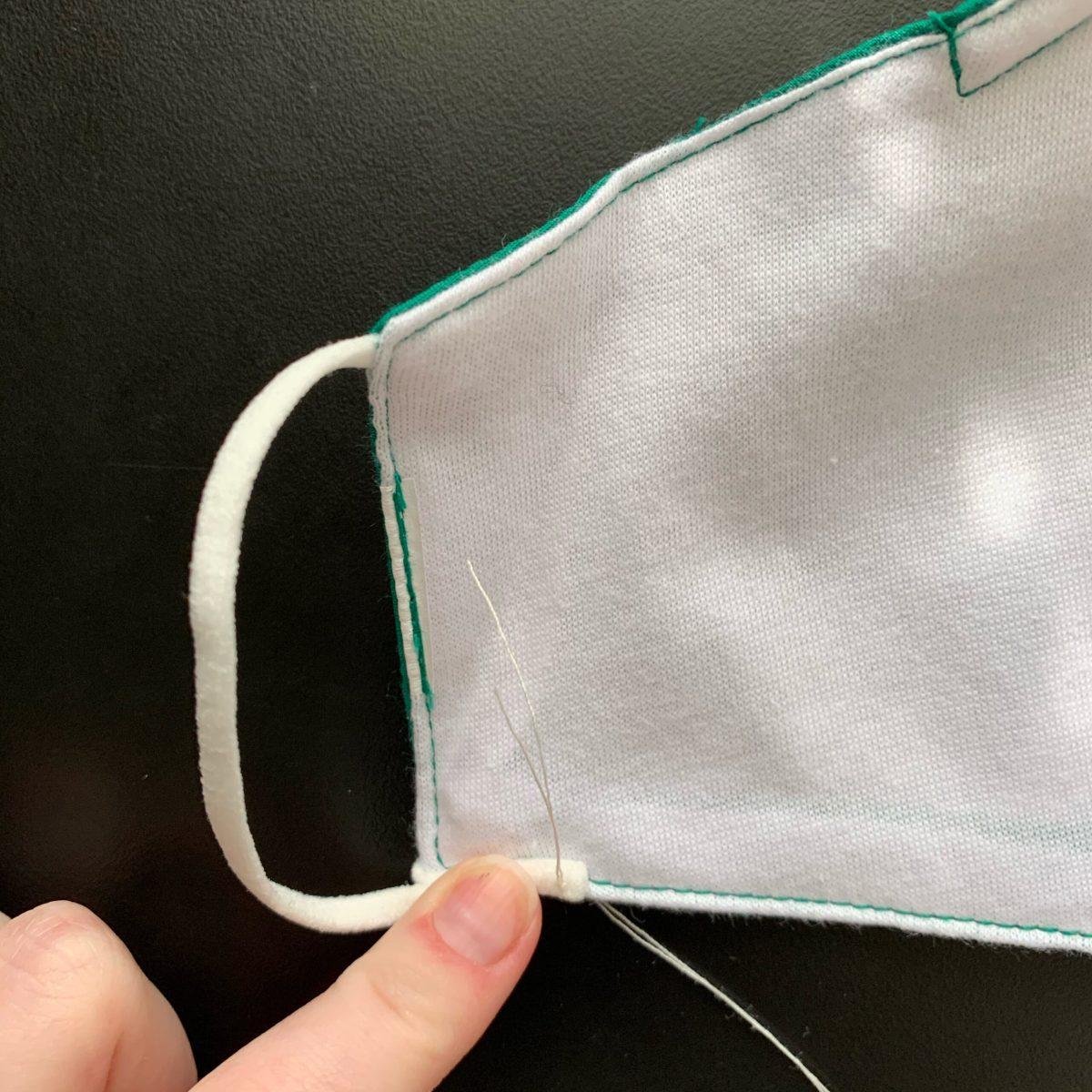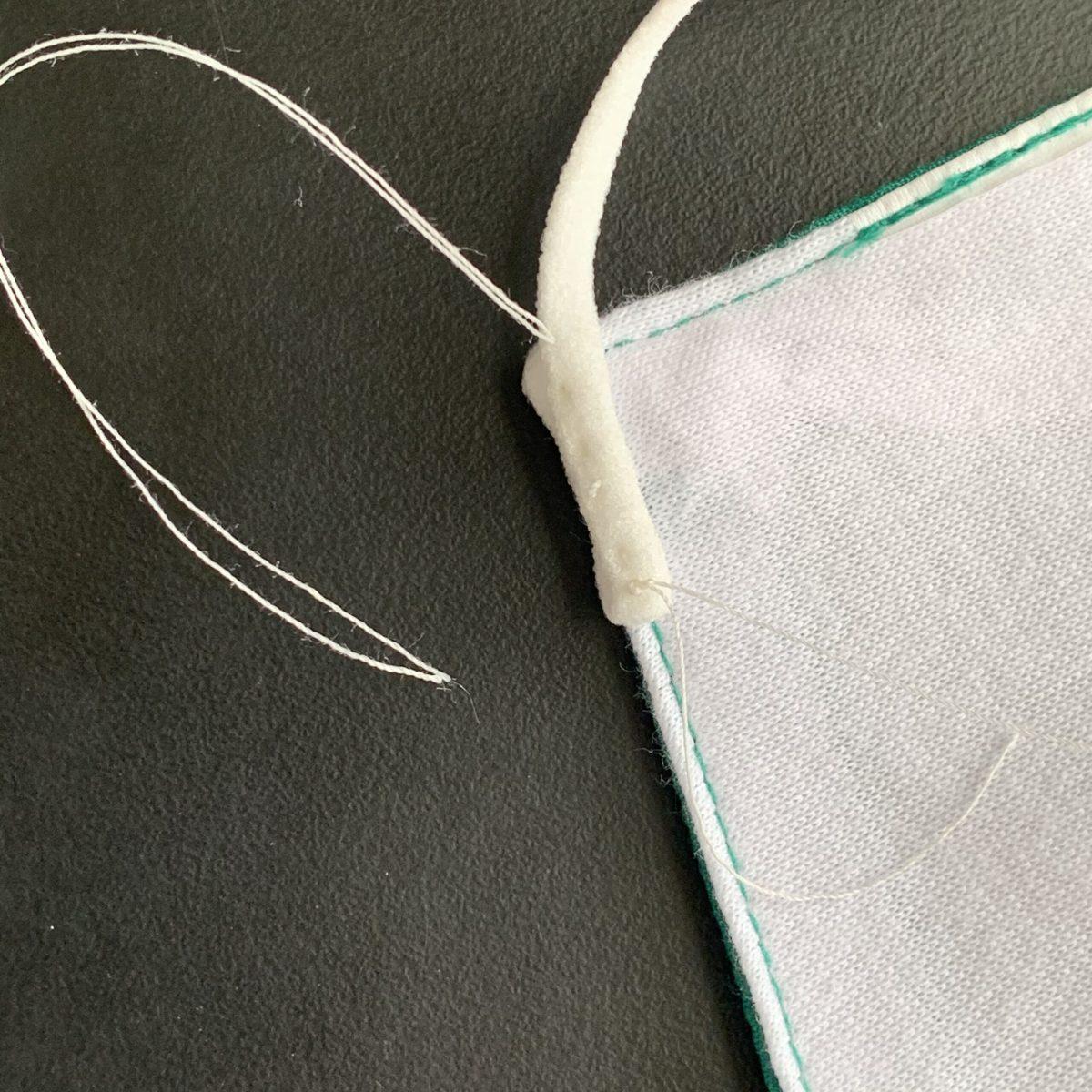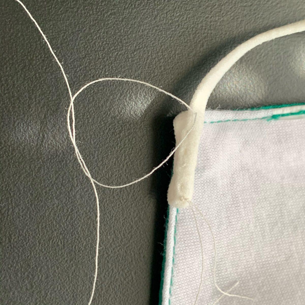 Here is where you start sewing. Start from the inside of your mask so the knot doesn’t show on the outside. You’ll have to hold the fold in place firmly for the first two stitches but then it should stay in place.