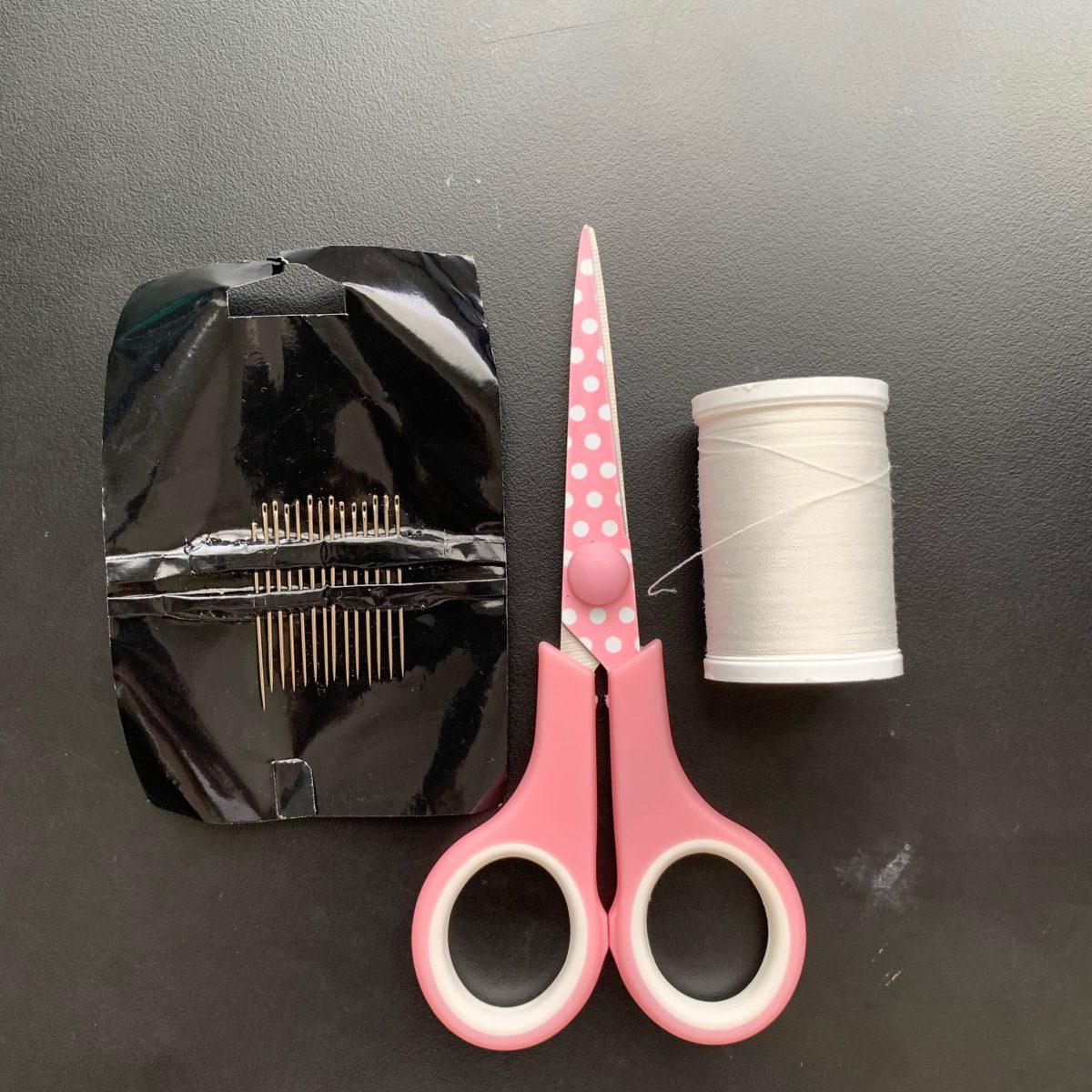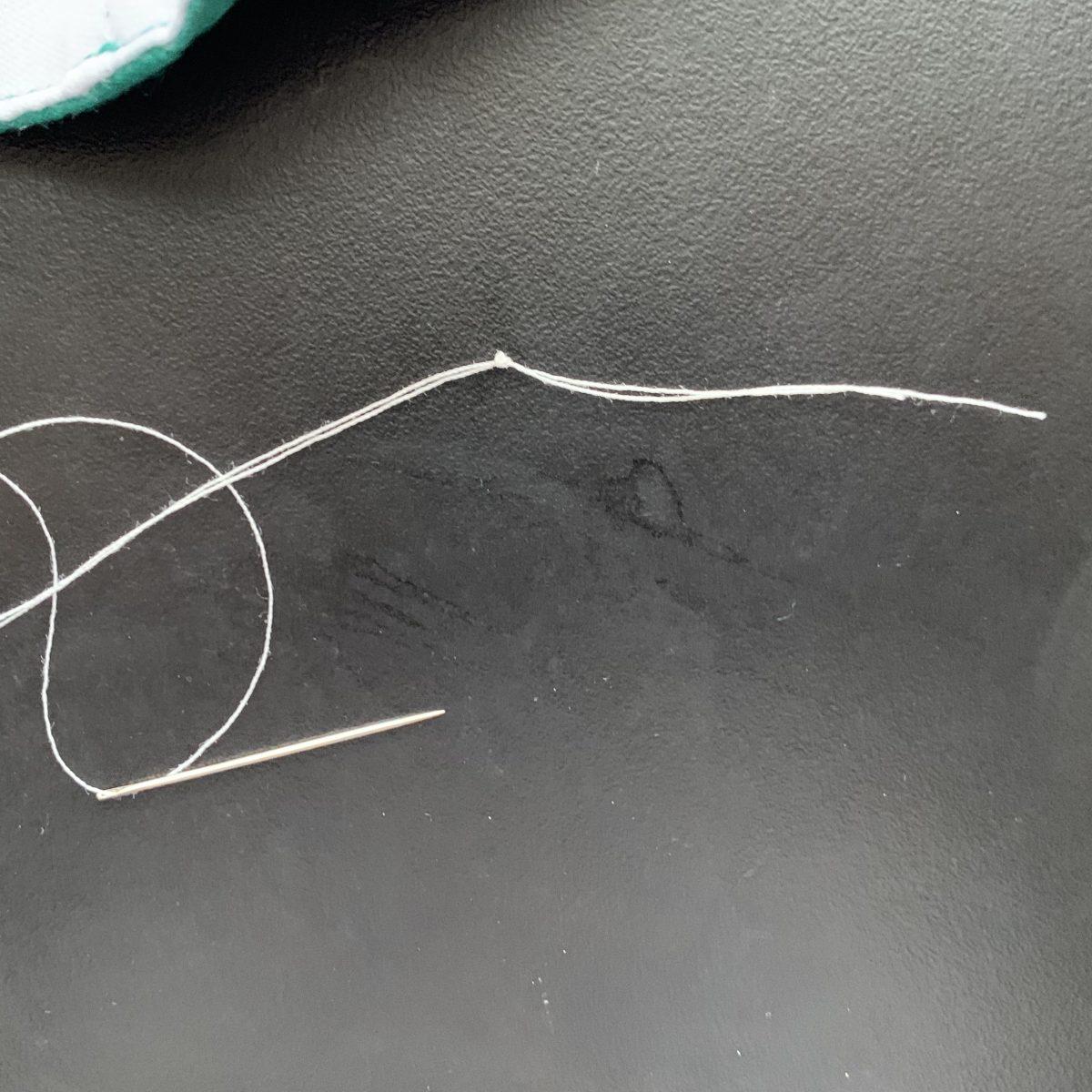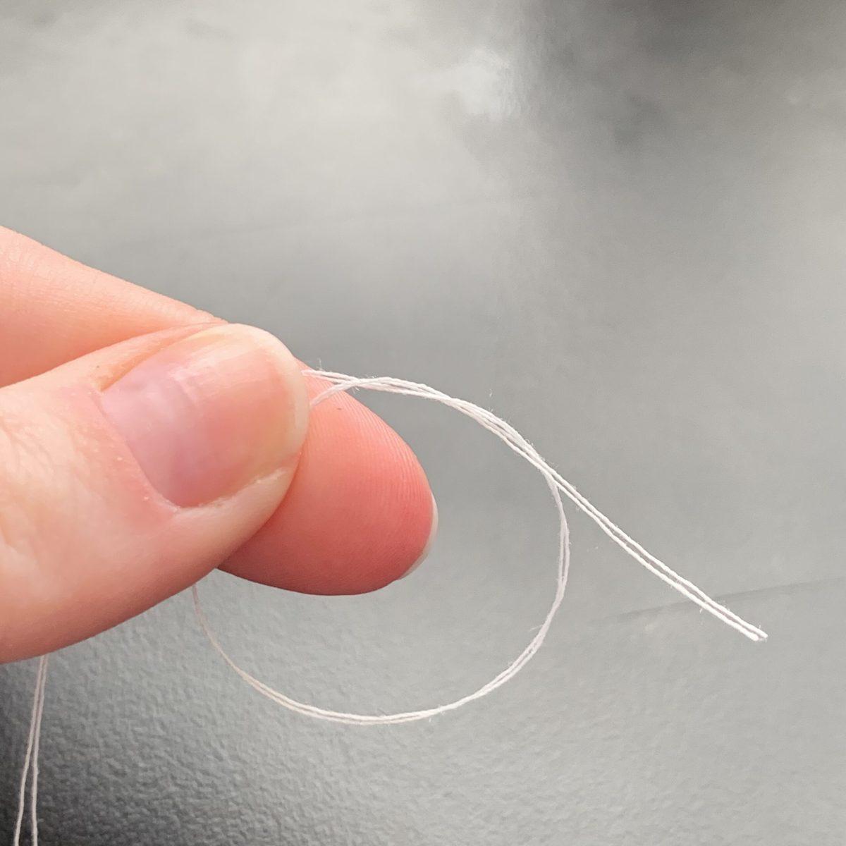 If you have trouble pushing the needle through, you can use a surface you’re at to push it. Even the looped side of the needle is somewhat sharp so don’t push on it too hard with your fingers.
