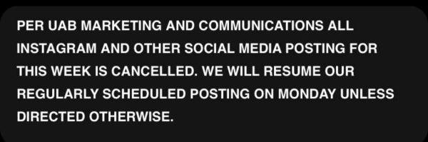 “Per UAB Marketing and Communications, all Instagram and other social media posting for this week is cancelled,” the message read. “We will resume our regularly scheduled posting on Monday unless directed otherwise.”