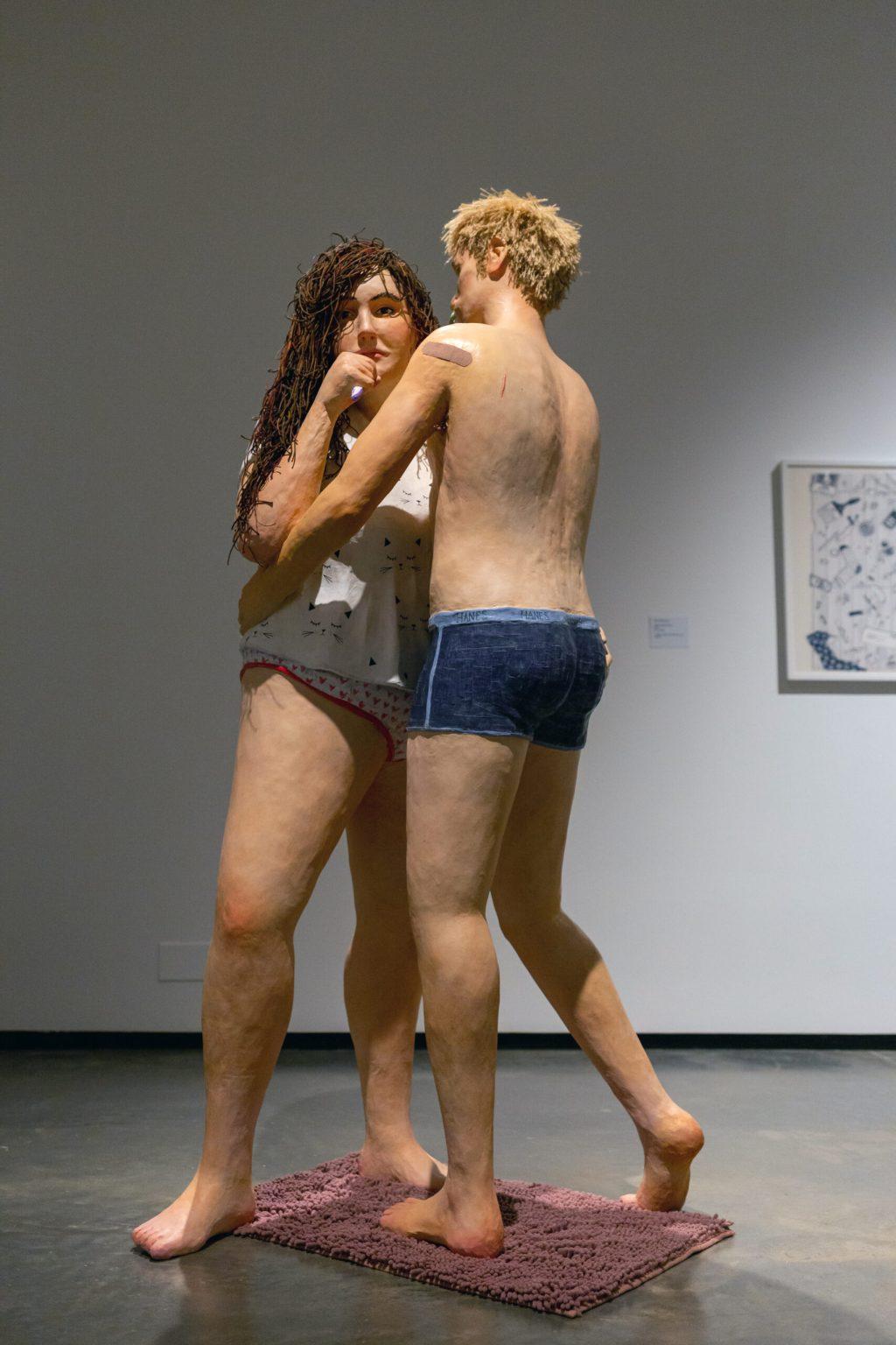 Another sculpture in the “Wednesday Night” exhibit is “Me and Stu (Brushing Teeth).” This sculpture displays McAndrew and her boyfriend casually embracing in their underwear while brushing their teeth. McAndrew shows us an everyday moment of intimacy between a plus-sized woman and a thinner man with the hopes of people growing used to this image.