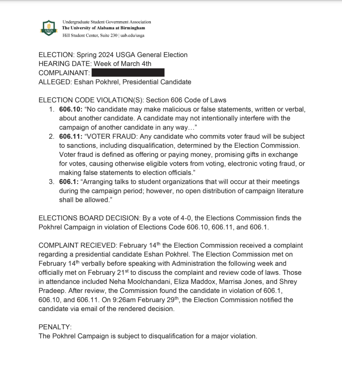 According to a document attached to an email sent by Moolchandani, the USGA Elections Commission met on February 21 and decided with a 4-0 vote that Pokhrel violated three election regulation codes. The Commission described those violated codes as the following: