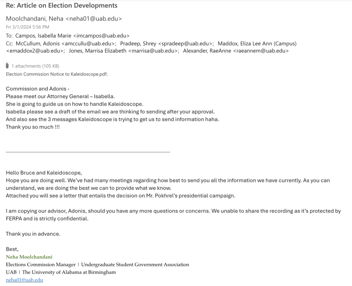 Kaleidoscope obtained the decision timeline in an attachment to a draft email from Moolchandani addressed to USGA members and a staff adviser on how to respond to Kaleidoscope’s inquiries. The draft email was also sent to Kaleidoscope leadership. Kaleidoscope received a formal follow-up email from Attorney General Isabella Campos.