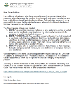 - 606.11: “VOTER FRAUD: Any candidate who commits voter fraud will be subject to sanctions, including disqualification, determined by the Election Commission. Voter fraud is defined as offering or paying money, promising gifts in exchange for votes, causing otherwise eligible voters from voting, electronic voting fraud, or making false statements to election officials.”